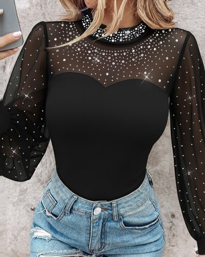 Kadın uzun kollu yarı balıkçı yaka taşlı sandy bluz